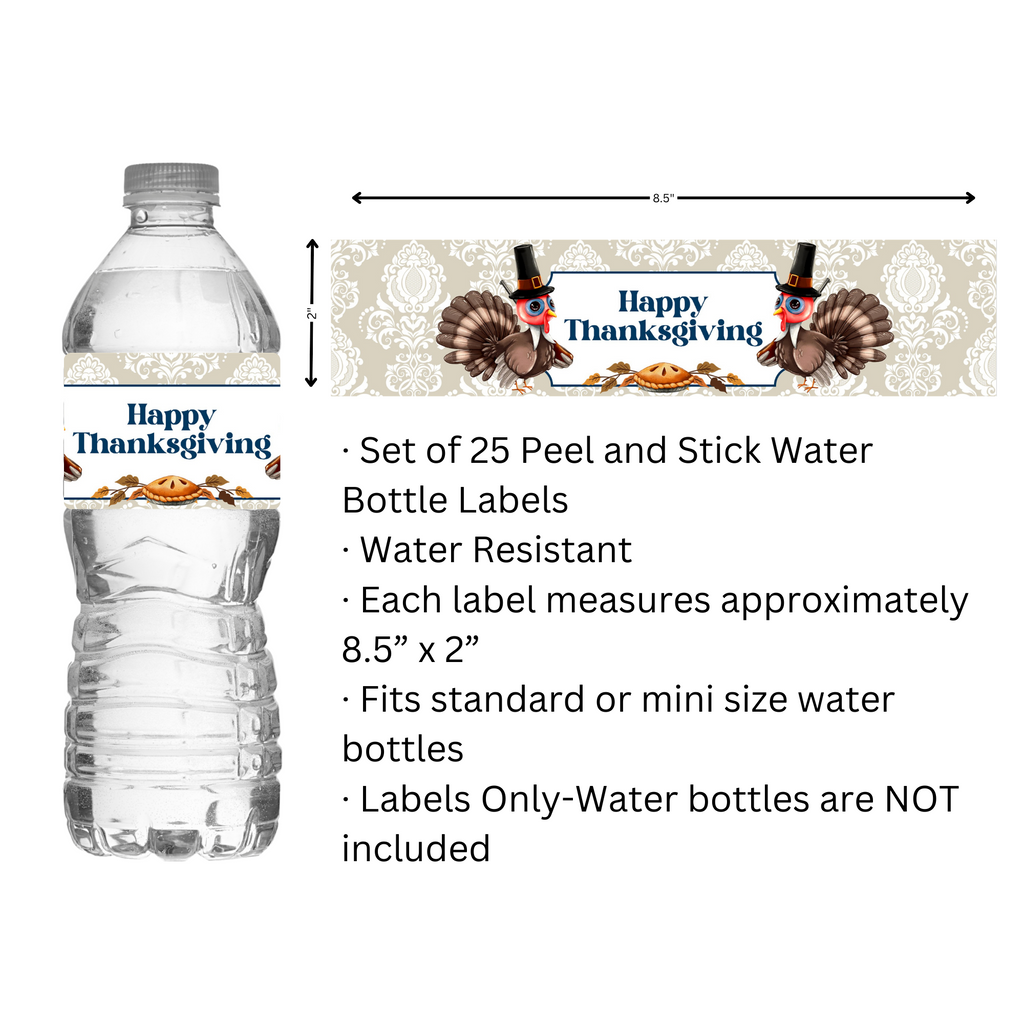 • Thanksgiving Water Bottle Labels are sold in packs of 25. You will receive 25 water bottle labels for each unit ordered.
