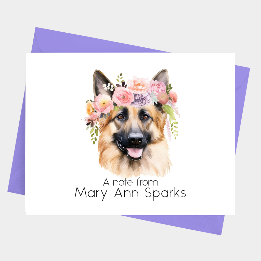 Celebrate your love for German Shepherds with these charming German Shepherd Note Cards! Perfect for dog lovers, each card features a delightful German Shepherd with a floral crown that adds a fun and personal touch to your messages. Includes matching envelopes, making them ideal for heartfelt notes, thank-yous, or just saying hello. Brighten someone’s day with stationery as playful as your furry friend!